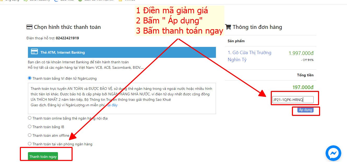 Ở đây Ebila hướng dẫn bạn thanh toán chuyên đề Gõ Cửa Thị Trường Nghìn Tỷ Giá niêm yết: 197K (dùng mã JP21-1QPK-HRNQ bạn sẽ được học hoàn toàn miễn phí)
