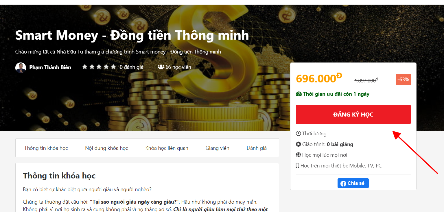 Ở đây mình chọn khóa "SM1 - Smart Money - Đồng tiền thông minh" Giá niêm yết: 696K (dùng mã PH2J-RQ3E-J3MV chỉ còn 196K)
