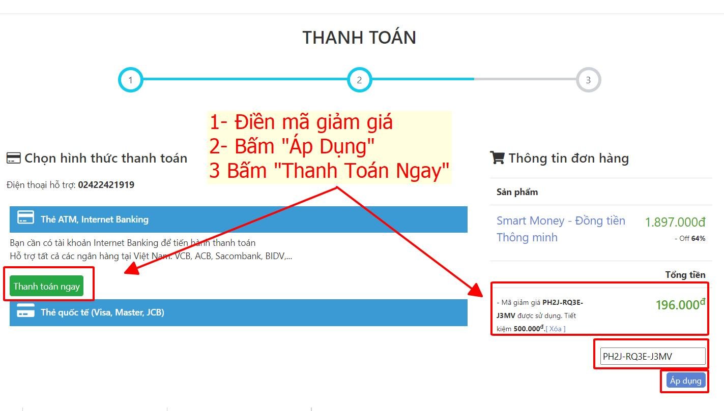 Ví dụ: Khi bạn thanh toán: Khóa "SM1 - Smart Money - Đồng tiền thông minh" Giá niêm yết: 696K (dùng mã PH2J-RQ3E-J3MV chỉ còn 196K)