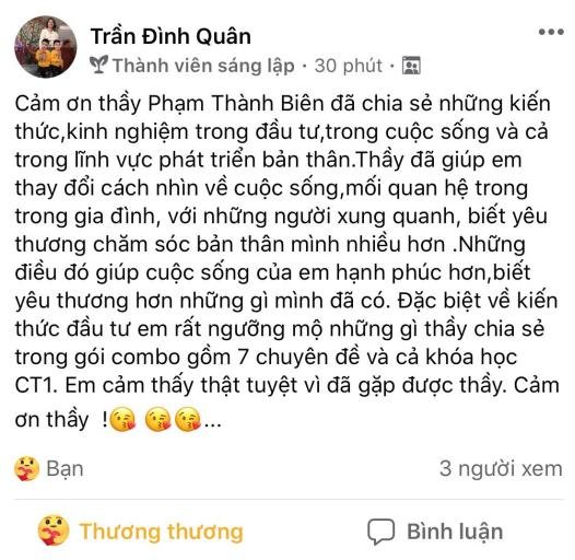 Ông là người chia sẻ và truyền cảm hứng cho hàng nghìn nhà đầu tư tại Việt Nam. Bên cạnh đó với rất nhiều nghiên cứu đã áp dụng thành công, vừa là chuyên gia phân tích xu hướng của thị trường tài chính, đồng thời là Nhà Đầu tư chuyên nghiệp trực tiếp giao dịch.
